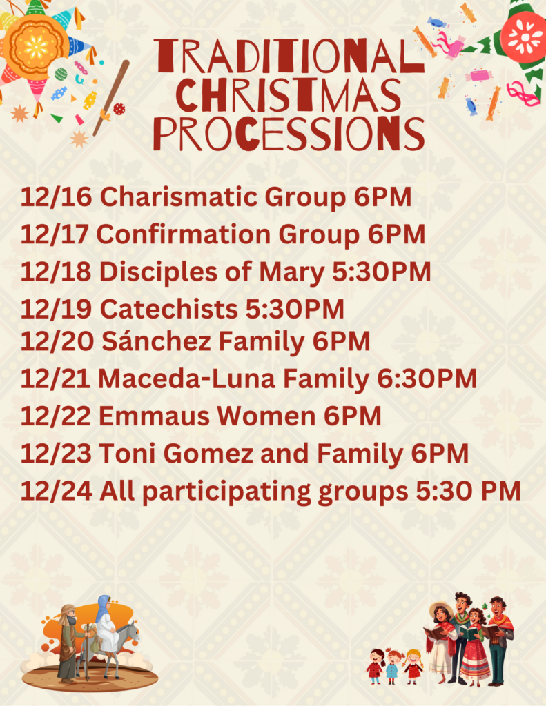 Our parish celebrates Las Posadas from December 16 through December 24. Please consult our December bulletins for specific dates, times, and locations, and join us as we walk together in prayer, tradition, and joyful anticipation of the birth of Jesus.